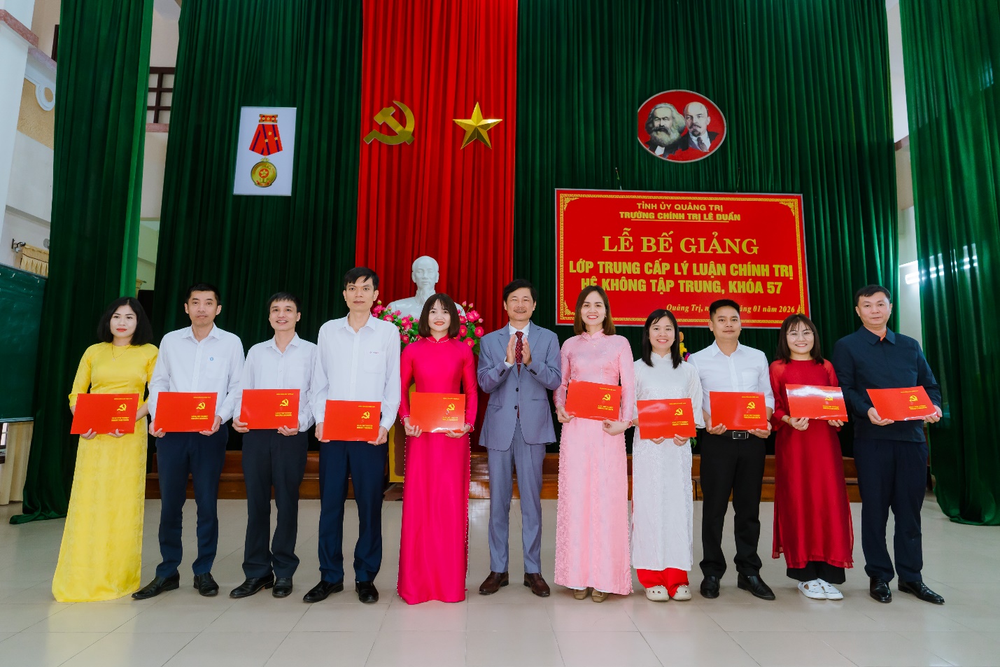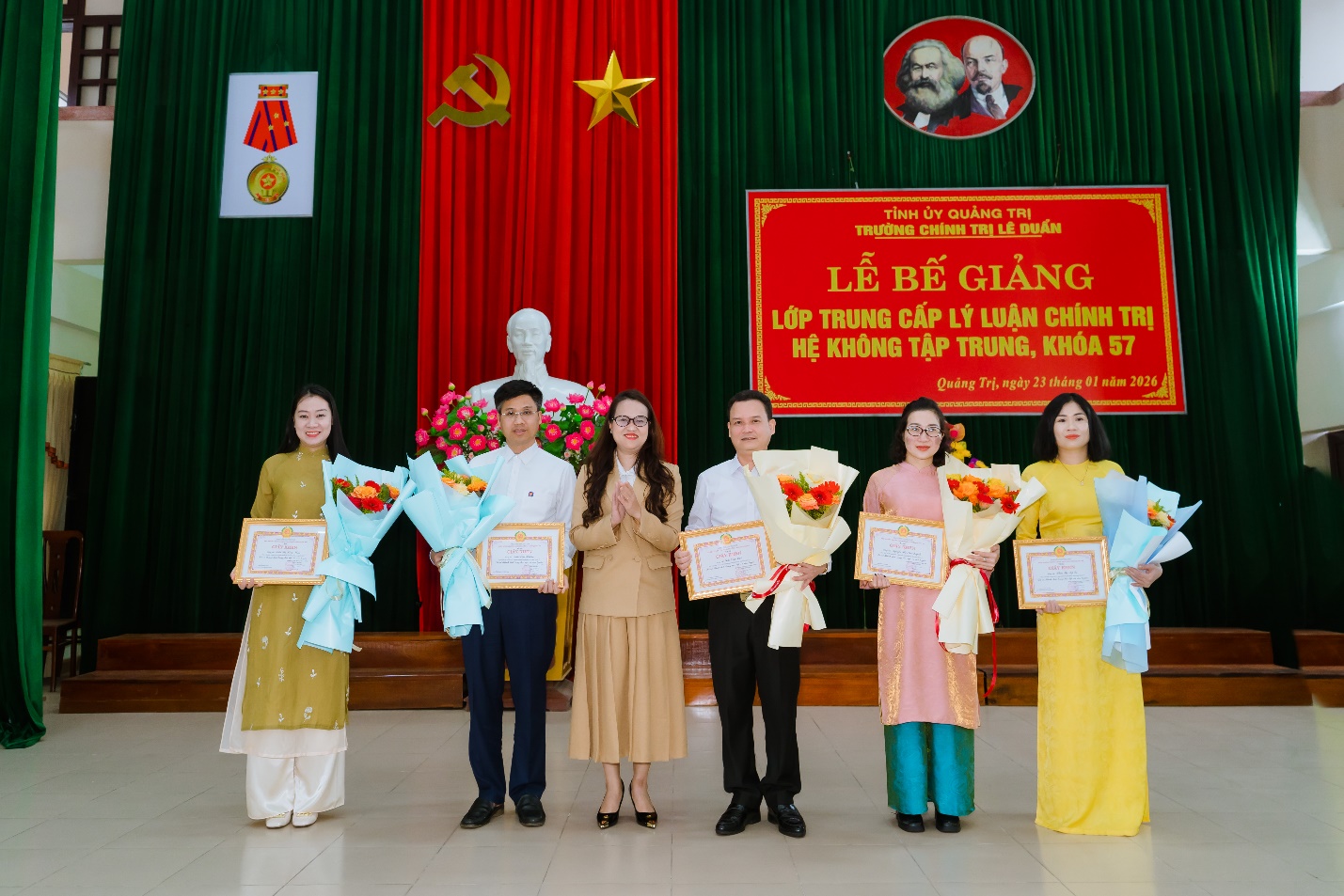 Chiều 23/01/2026, tại Cơ sở 2 (phường Nam Đông Hà), Trường Chính trị Lê Duẩn tỉnh Quảng Trị tổ chức Lễ Bế giảng Lớp Trung cấp Lý luận chính trị, hệ không tập trung, khóa 57. Đến dự có TS. Dương Hương Sơn, Phó Bí thư Đảng ủy, Phó Hiệu trưởng; TS. Thái Thị Hồng Minh, UVBTV Đảng ủy, Phó Hiệu trưởng; đại diện lãnh đạo các khoa, phòng; giáo viên chủ nhiệm và toàn thể học viên của lớp học.