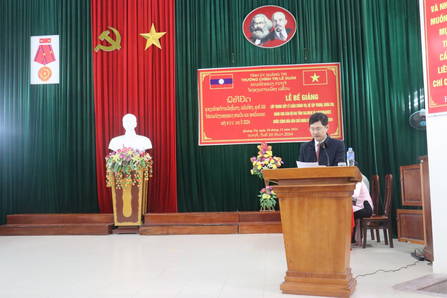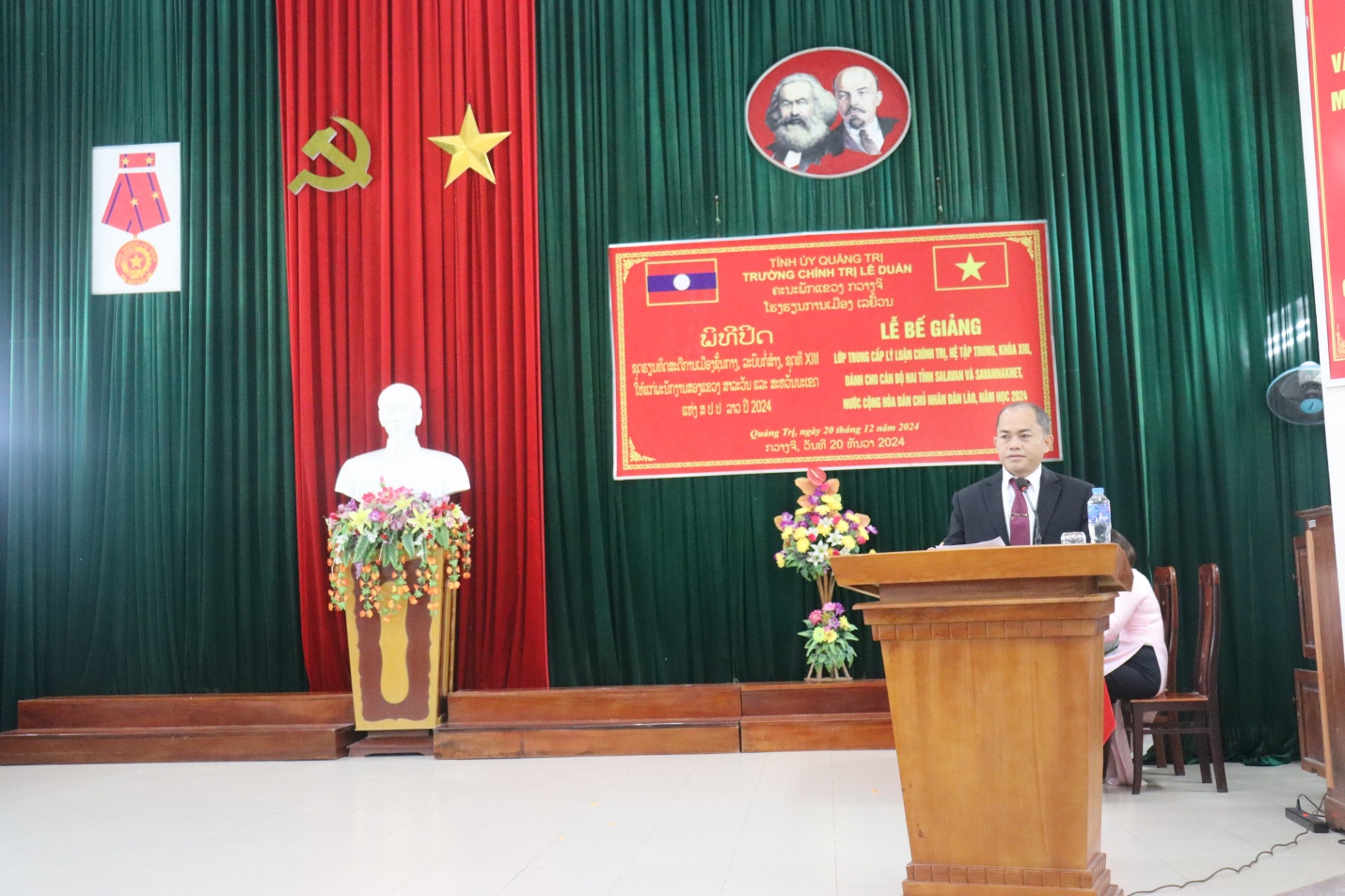 Đến dự Lễ Bế giảng, về phía hai tỉnh Salavan và Savannakhet, có đồng chí Khăm Bâu Xay Nhã Xít, Phó Trưởng Ban Tổ chức tỉnh Salavan; đồng chí Xăm Phăn Phăn Lan, Trưởng Phòng Tổ chức cán bộ, Ban Tổ chức tỉnh Savannakhet. Về phía lãnh đạo tỉnh Quảng Trị, có đồng chí Phan Văn Phụng, Ủy viên Ban Thường vụ, Trưởng Ban Tổ chức Tỉnh ủy Quảng Trị; Đại diện lãnh đạo Ban Tuyên giáo Tỉnh ủy, Văn phòng Tỉnh ủy, Sở Ngoại vụ, Sở Tài chính, Bộ Chỉ huy Bộ đội Biên phòng tỉnh, Công an tỉnh, Trường Cao đẳng Sư phạm Quảng Trị, phóng viên Đài Phát thanh và Truyền hình tỉnh, Báo Quảng Trị, phiên dịch viên.