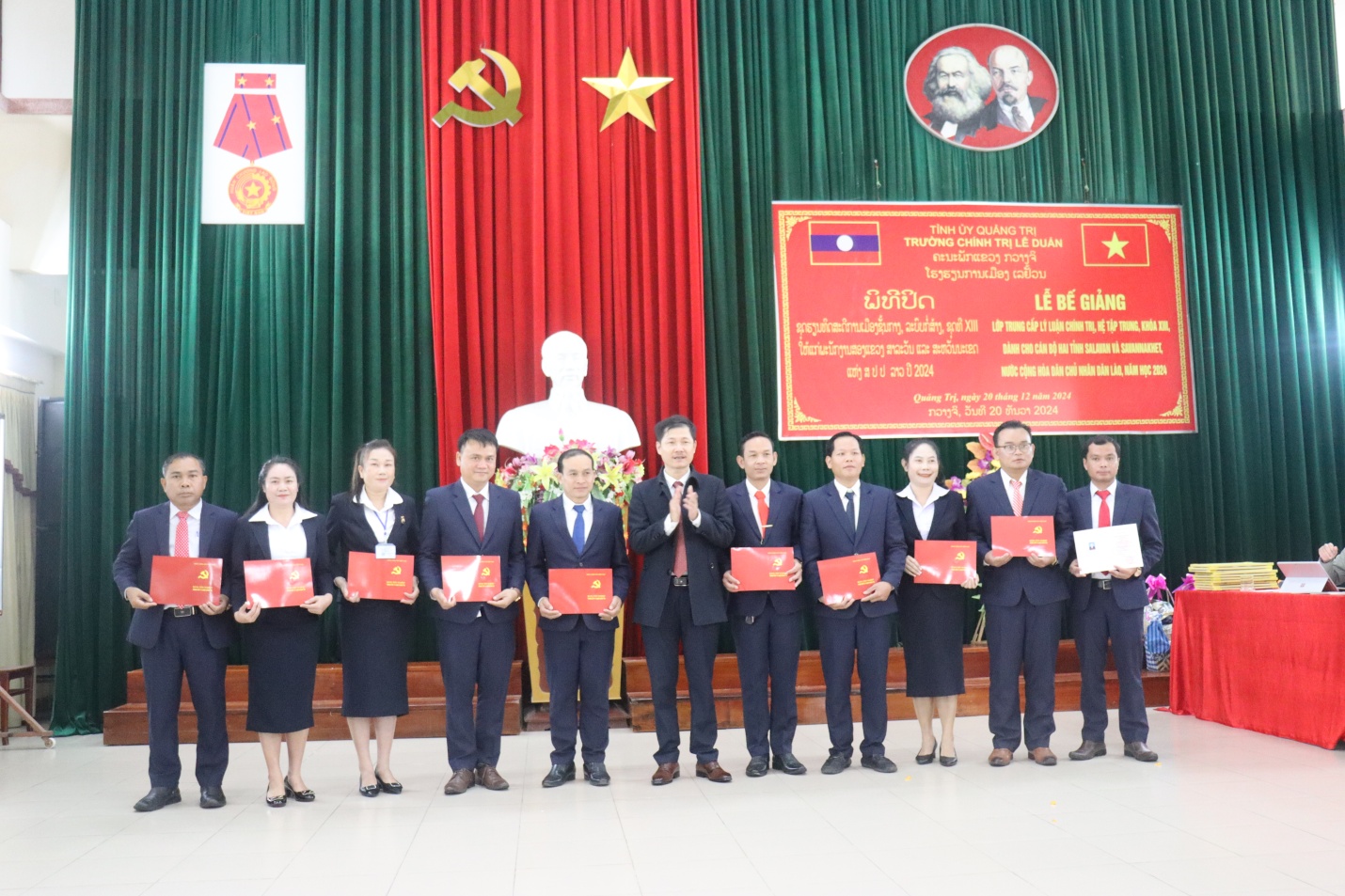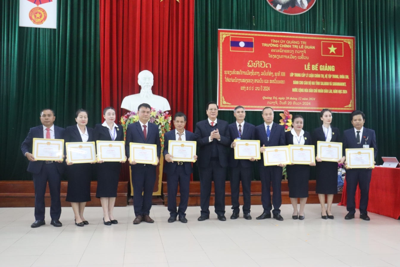 Sáng 20/12/2024, Trường Chính trị Lê Duẩn tổ chức Lễ Bế giảng Lớp Trung cấp Lý luận chính trị khoá XIII dành cho cán bộ hai tỉnh Salavan và Savannakhet (nước Cộng hòa dân chủ nhân dân Lào).